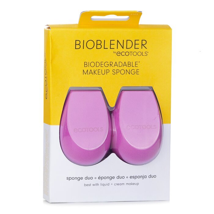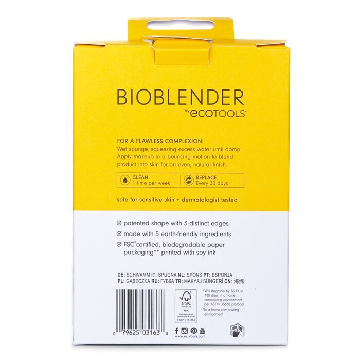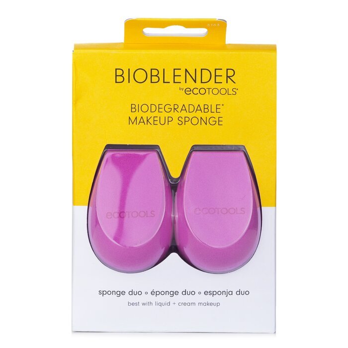 Bioblender Make Up Sponge Duo: 1 X Bioblender Make Up Sponge 1 X Bioblender Make Up Sponge A biodegradable makeup sponge Made with 5 earth-friendly, clean ingredients including water, corn, bionanopol, natural preservative & natural pigment, so you can create flawless, glowing skin without the added waste Features a patented shape with 3 distinct edges to bounce foundation, blend concealer, contour, set powder & clean up lines with ease The damp sponge is for a sheer, dewy glo while the dry sponge is for fuller coverage & touch-ups Safe for sensitive skin Vegan & cruelty-free